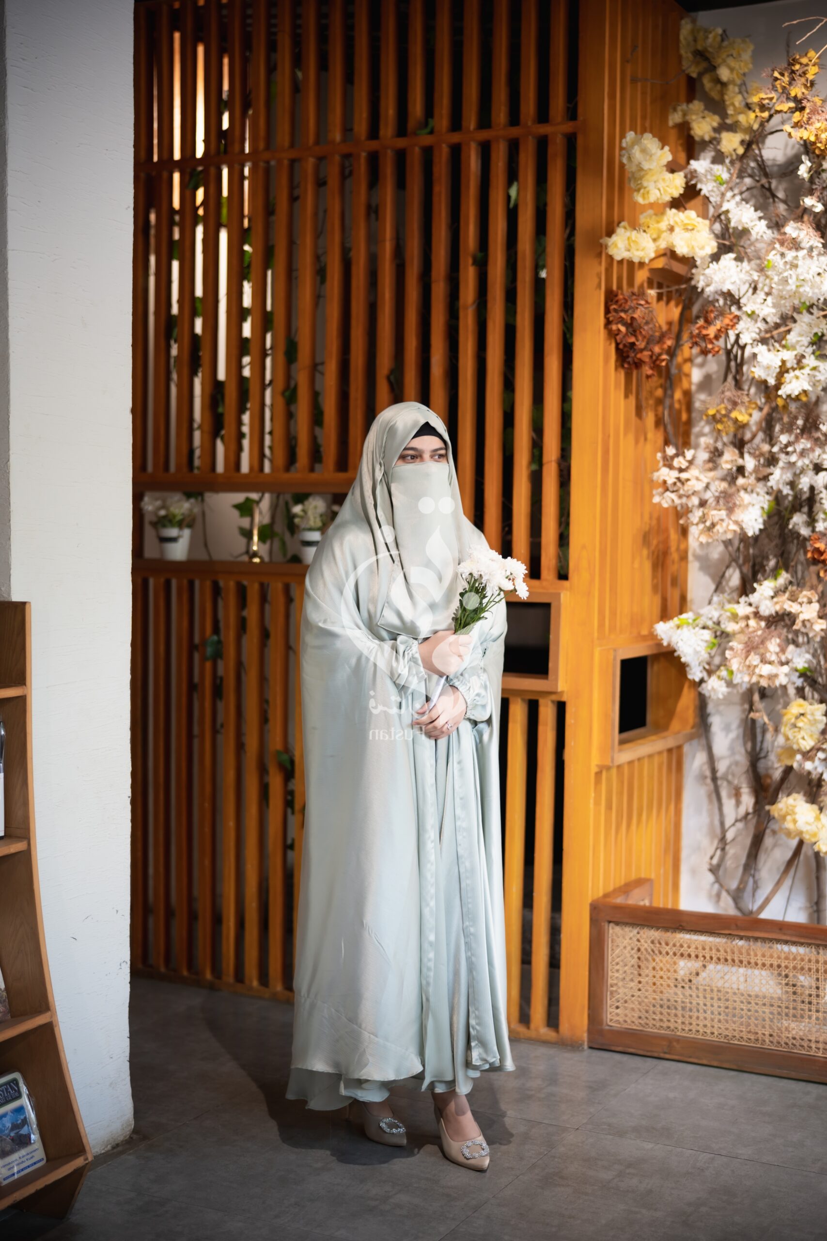 Marvelously crafted on a smooth crinkle silk pistachio fabric, this enchanting Abaya resonates decency and girly pride. It comes with an Irani chadar for that extra glame.